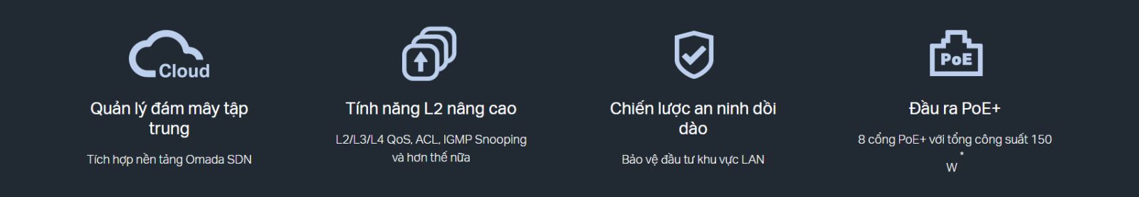 Ngân sách PoE 150 W : 8× cổng PoE+ tuân thủ 802.3at/af với tổng nguồn điện là 150 W * .