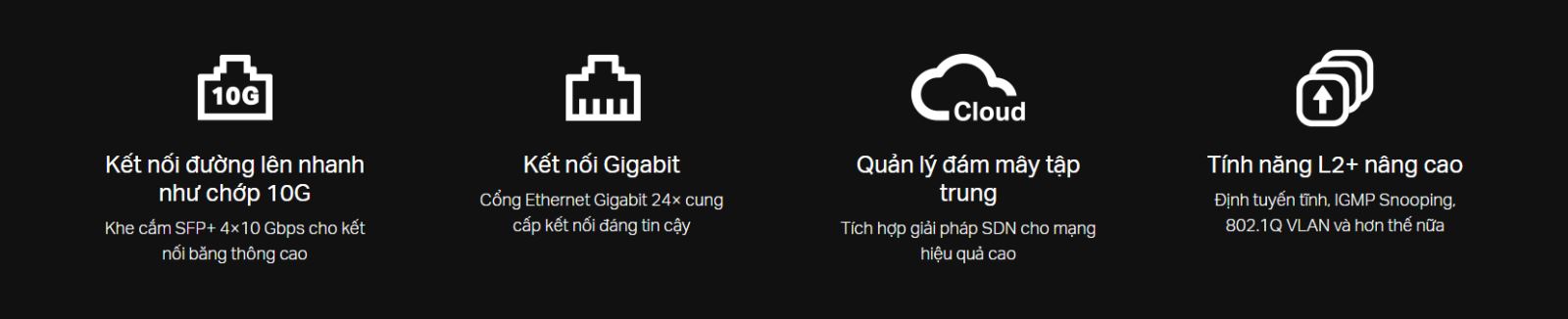 Đường lên nhanh như chớp 10G: Các khe cắm SFP+ 4×10 Gbps cho phép kết nối băng thông cao và khả năng chuyển mạch không bị chặn.