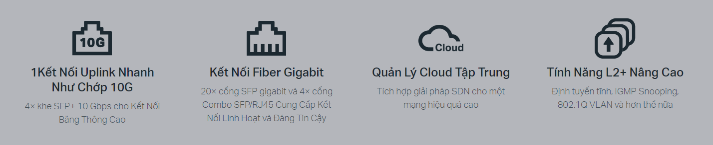 Uplink nhanh như chớp 10G: 4 x khe SFP+ 10 Gbps cho phép kết nối băng thông cao và khả năng chuyển đổi không chặn.