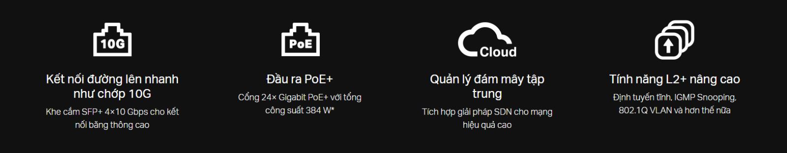 Đường lên nhanh như chớp 10G: Các khe cắm SFP+ 4×10 Gbps cho phép kết nối băng thông cao và khả năng chuyển mạch không bị chặn.
