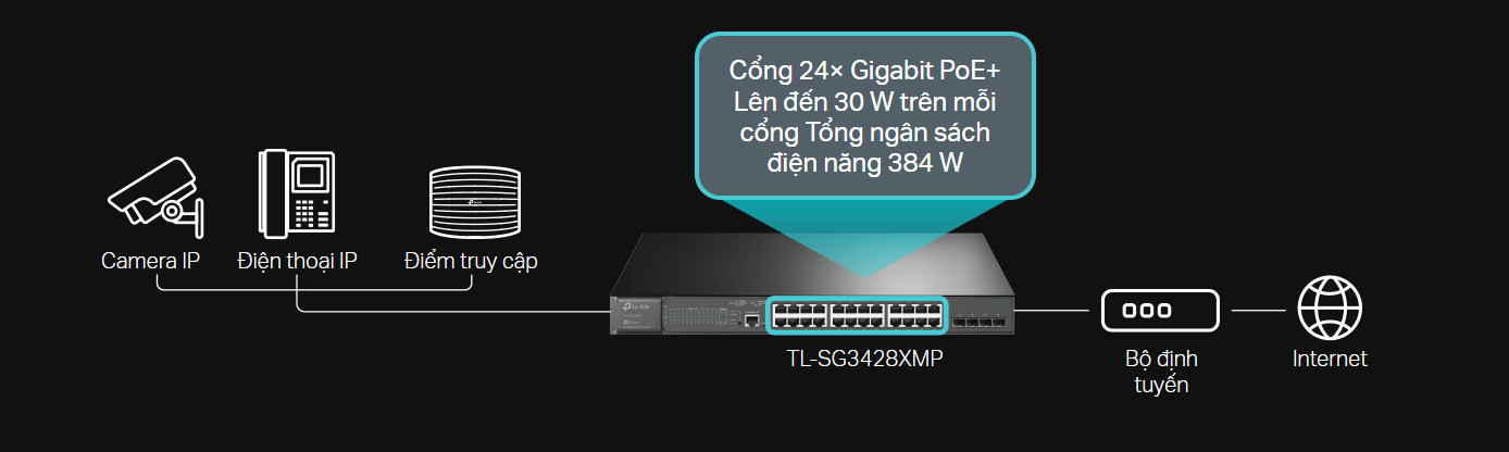 Có 24× 802.3af/at các cổng PoE+ tương thích, bộ chuyển mạch hỗ trợ tổng công suất PoE lên tới 384 W.* Được thiết kế để sử dụng một cáp Ethernet duy nhất cho cả truyền dữ liệu và điện, nó cung cấp khả năng triển khai linh hoạt cho các thiết bị hỗ trợ PoE như mạng không dây điểm truy cập, camera IP và điện thoại IP, giảm chi phí cơ sở hạ tầng cho các doanh nghiệp nhỏ.