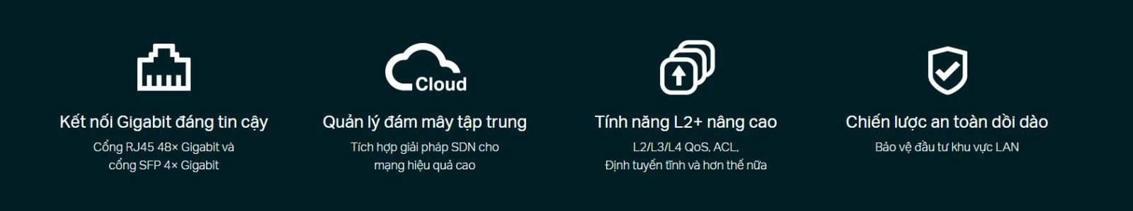 Cổng Gigabit đầy đủ: Cổng RJ45 48× gigabit và Khe cắm SFP 4× gigabit cung cấp kết nối tốc độ cao.