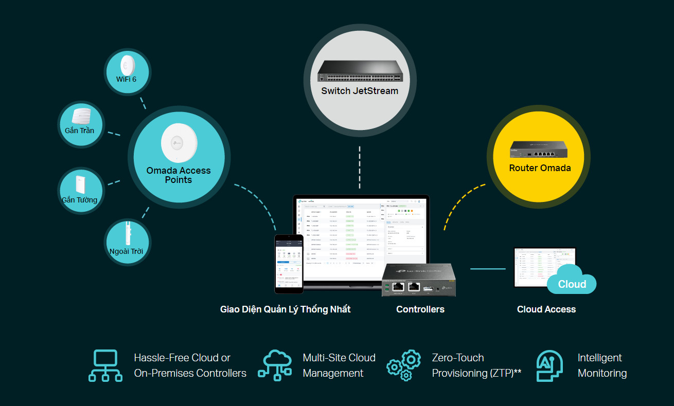 Quản Lý Cloud Tập Trung: Tích hợp vào Omada SDN để truy cập cloud và quản lý từ xa.