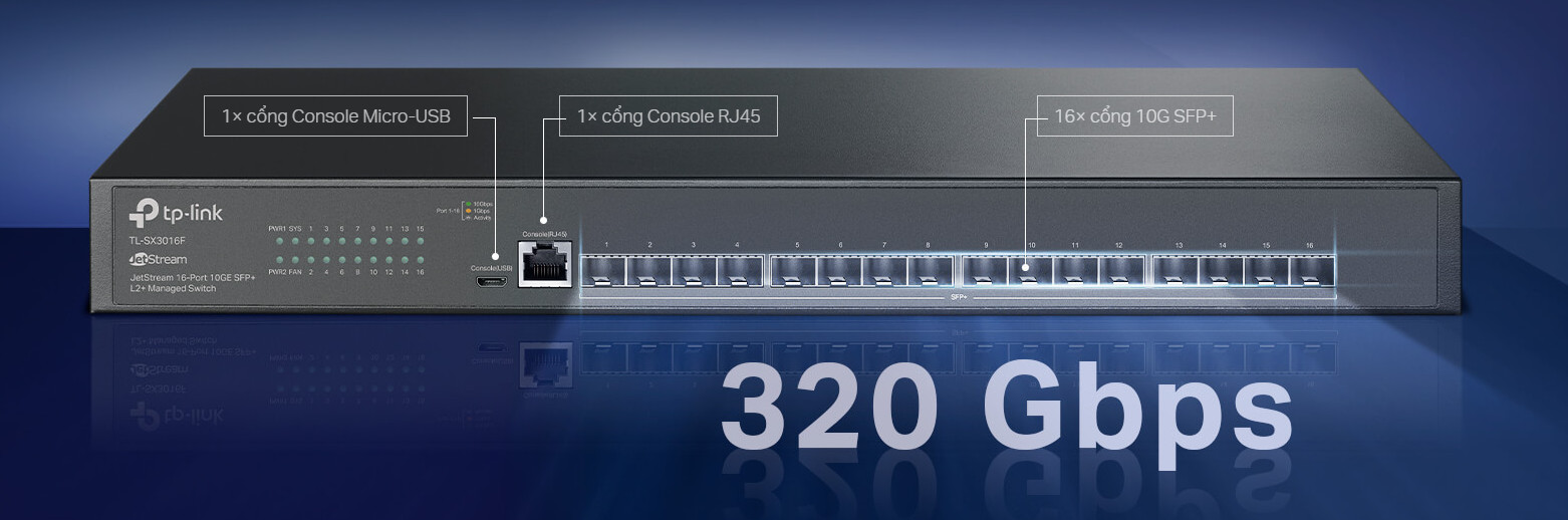 16 Cổng SFP+ Full 10GE: Cổng SFP+ Full 10 Gbps nhanh như chớp cung cấp khả năng kết nối tổng hợp băng thông cao và khả năng chuyển đổi 320 Gbps không chặn.