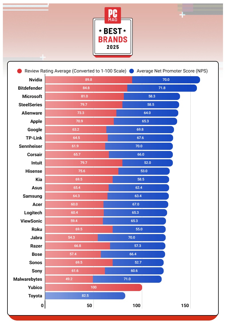 PCMag là một trong những tạp chí công nghệ uy tín nhất thế giới, chuyên đánh giá và xếp hạng các thương hiệu dựa trên hàng năm phân tích chuyên sâu, thử nghiệm sản phẩm và khảo sát ý kiến người tiêu dùng. Xếp hạng Best Tech Brands for 2025 của PCMag tổng hợp đánh giá từ hơn 635 thương hiệu công nghệ, trong đó chỉ top 4% đạt điểm số cao nhất mới có mặt trong danh sách. Phương pháp đánh giá kết hợp giữa điểm trung bình từ các bài đánh giá sản phẩm trên PCMag.com và chỉ số Net Promoter Score (NPS) – thước đo mức độ hài lòng và khả năng giới thiệu thương hiệu của khách hàng.