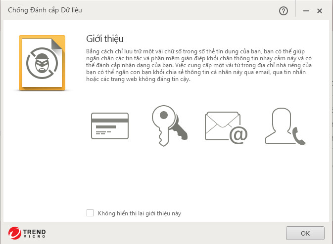 Trend Micro có thể giúp ngăn chặn tin tặc và các phần mềm gián điệp ăn cắp số thẻ tín dụng, mật khẩu, và các dữ liệu nhạy cảm khác. Bây giờ, bạn có thể sử dụng các dữ liệu bí mật được đưa vào các trang web, thư điện tử hay tin nhắn IM. Sử dụng danh mục định trước, hoặc thiết lập những cái mới của riêng bạn.