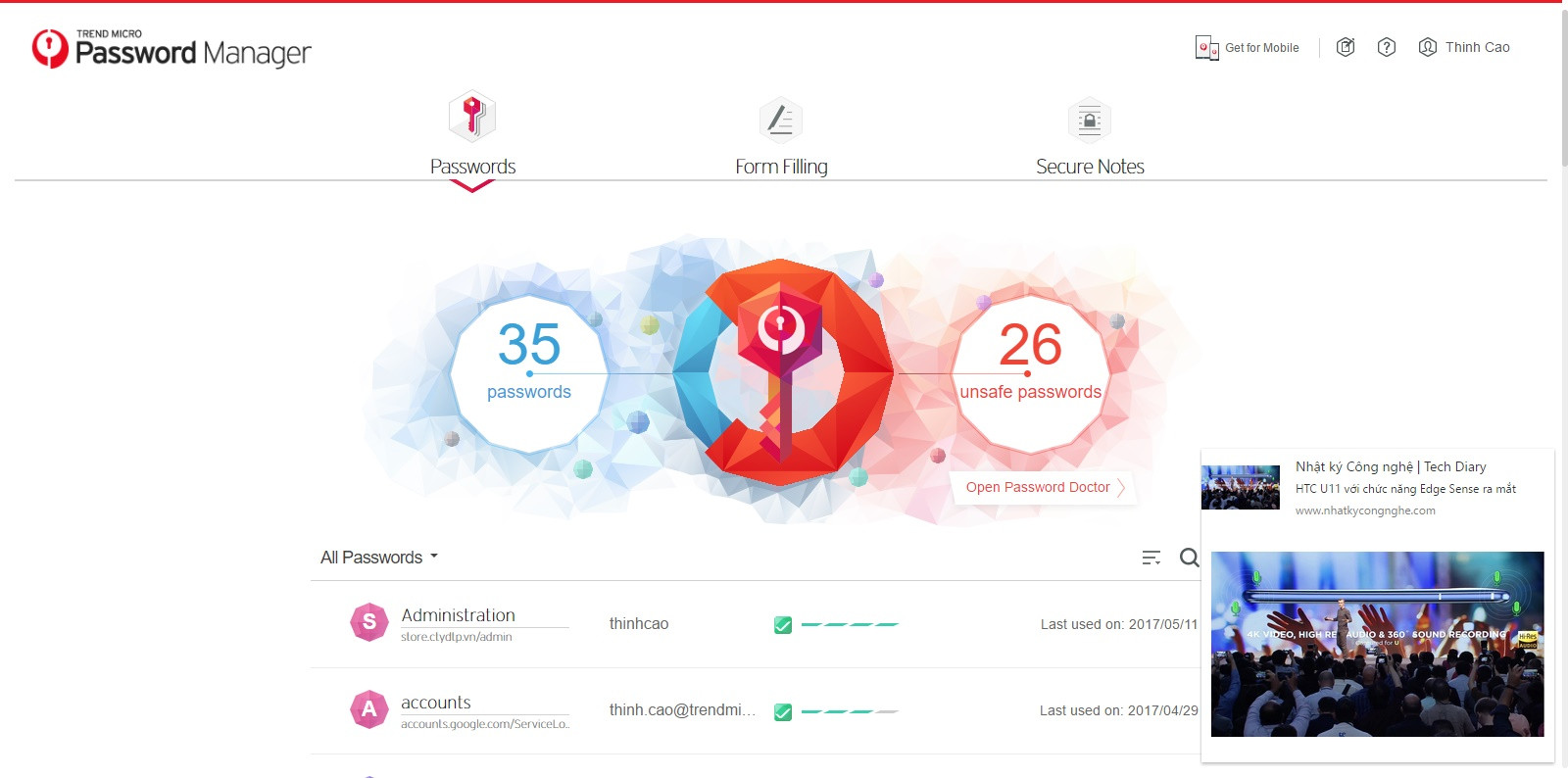 Password Manager của Trend Micro giúp bạn lưu giữ và quản lý dễ dàng tất cả các tài khoản trên Internet bằng các lưu lại chúng ở một nơi an toàn và giúp bạn tự động đăng nhập khi truy cập web. Bạn chỉ cần nhớ duy nhất 1 mật khẩu chính.