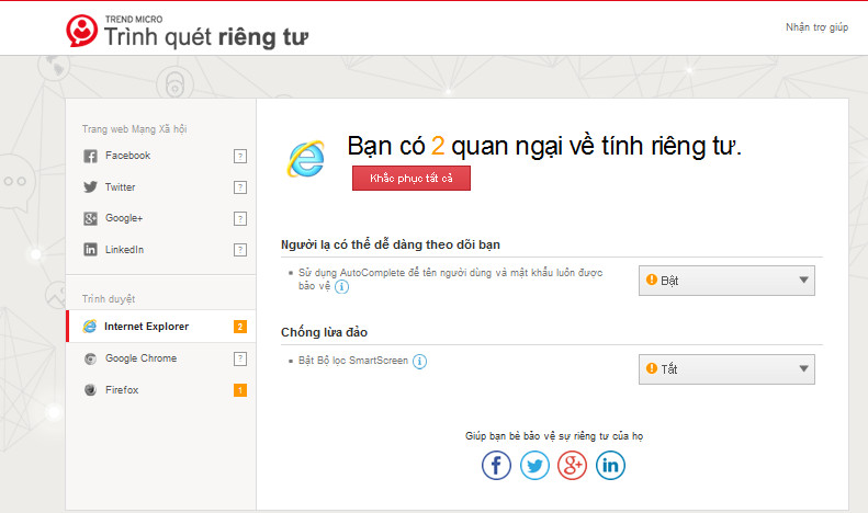 Khi Trend Micro Maximum Security 15 (2019) xác định một liên kết xấu, nó còn cho phép bạn dễ dàng và nhanh chings cảnh báo cho các bạn bè của bạn. Trend Micro Maximum Security 15 (2019) có thể bảo vệ bạn trực tuyến và cũng giúp những người bạn của bạn được an toàn. Tính Năng này cũng hoạt động trên Google+, LinkedIn, Pinterest, Mixi, MySpace, và Sina Weibo.