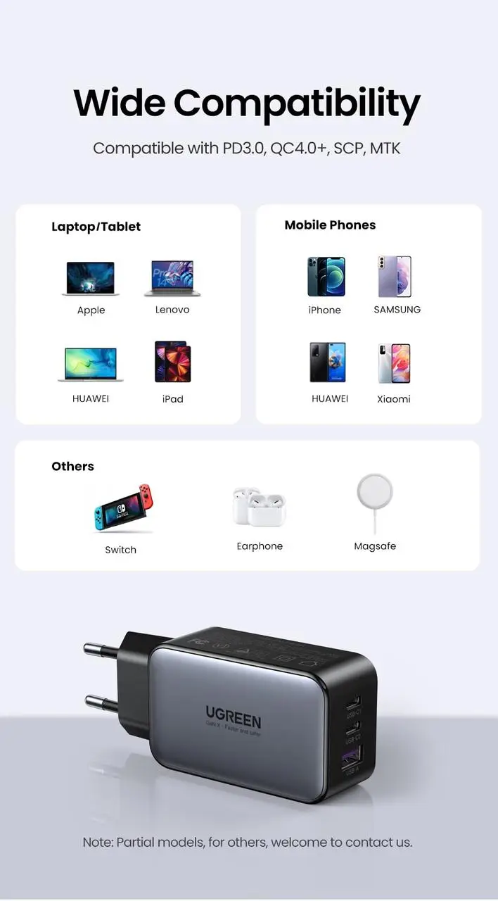 Khả năng tương thích rộng: Củ sạc Ugreen 65W 10335 cung cấp khả năng sạc nhanh cho hầu như tất cả các điện thoại, máy tính bảng, máy tính xách tay, máy tính xách tay, v.v., bao gồm cả MacBook Pro, MacBook Air, Dell XPS 13 inch, iPhone 13 / 13 Pro / 13 Pro Max / 13 Mini, iPhone 12 series, Galaxy S22 Ultra / S21 / S20, iPad Pro, MagSafe, Pixel 6/6 Pro / 5 / 4a và các thiết bị điện tử khác.