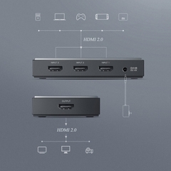 Ugreen 50709 Bộ chia HDMI 3 vào 1 ra hỗ trợ HDMI 2.0 CM188 là thiết bị tiện ích giúp bạn dễ dàng chia sẽ kết nối hình ảnh chất lượng cao với độ phân giải 4K60Hz và âm thanh 7.1 từ 3 bộ phát 4K như đầu đĩa, tv box, apple tv, đầu thu camera, … dùng chung 1 màn hình duy nhất, chuyển đổi kênh phát dễ dàng với 1 nút bấm hoặc sử dụng remote điều khiển từ xa tiện lợi.