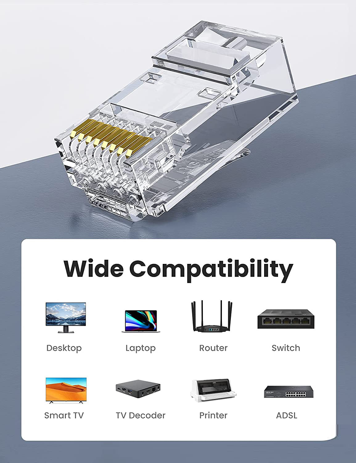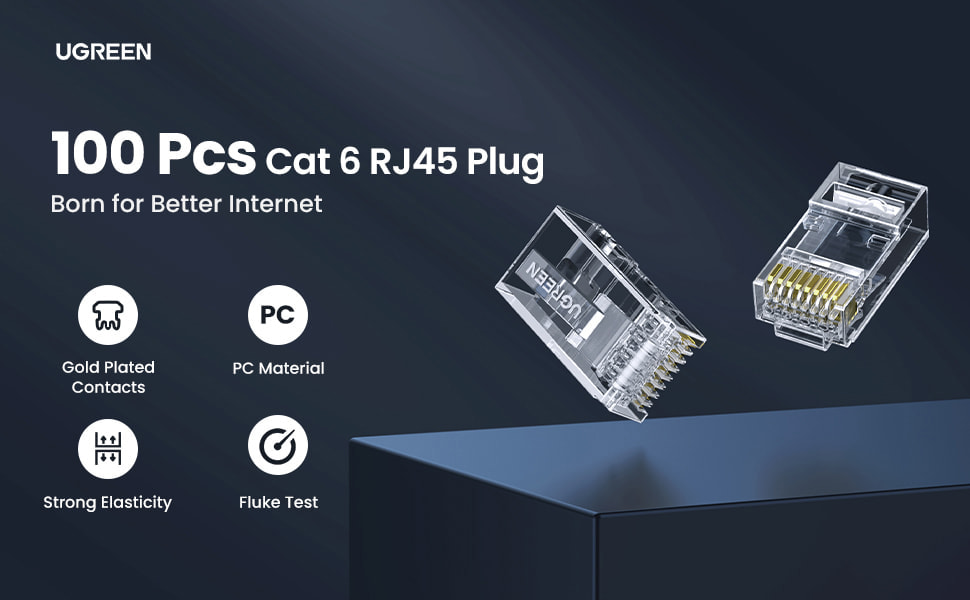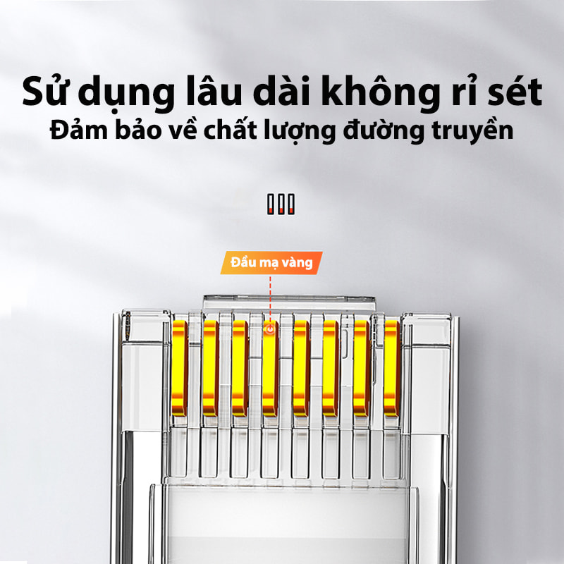 Đầu bấm mạng RJ45 Hộp 100 Ugreen 50246 được sản xuất bằng chất liệu cao cấp bao gồm các chân bấm bằng đồng nguyên chất mạ vàng 24K (lớp mạ dầy 50 micro met) và chất liệu nhựa cao cấp giúp đảm bảo khả năng dẫn truyền tín hiệu của các sợi cáp mạng cat5, cat5e.