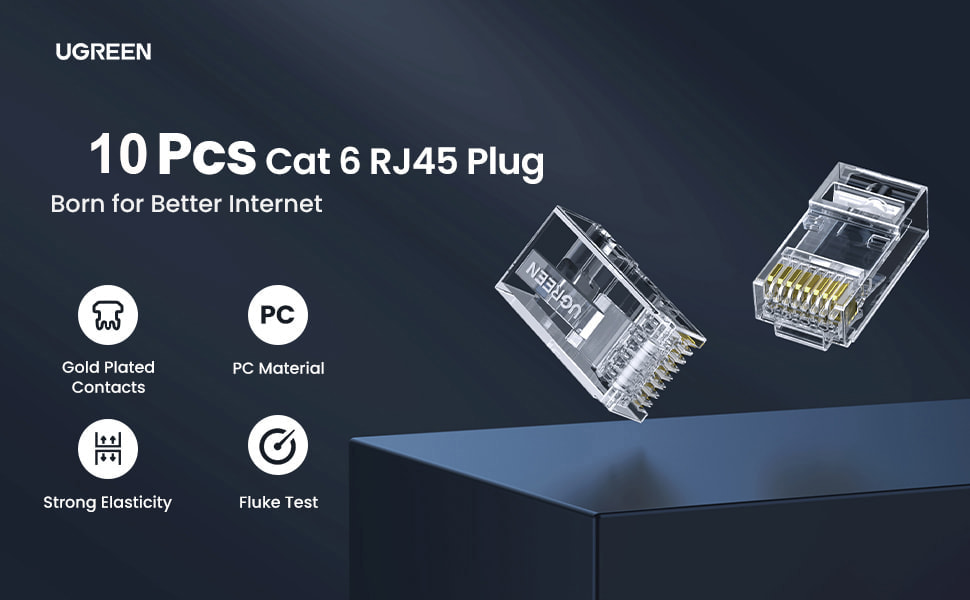 Đầu bấm mạng RJ45 Hộp 10C Ugreen 20329 được sản xuất bằng chất liệu cao cấp bao gồm các chân bấm bằng đồng nguyên chất mạ vàng 24K (lớp mạ dầy 50 micro met) và chất liệu nhựa cao cấp giúp đảm bảo khả năng dẫn truyền tín hiệu của các sợi cáp mạng cat5, cat5e.