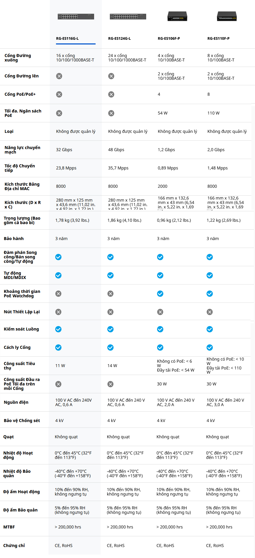 Bộ chuyển mạch RUIJIE RG-ES116G-L, Thiết bị chuyển mạch 16 cổng 10/100/1000 Mbps không quản lý được không PoEull-duplex, MAC 8K