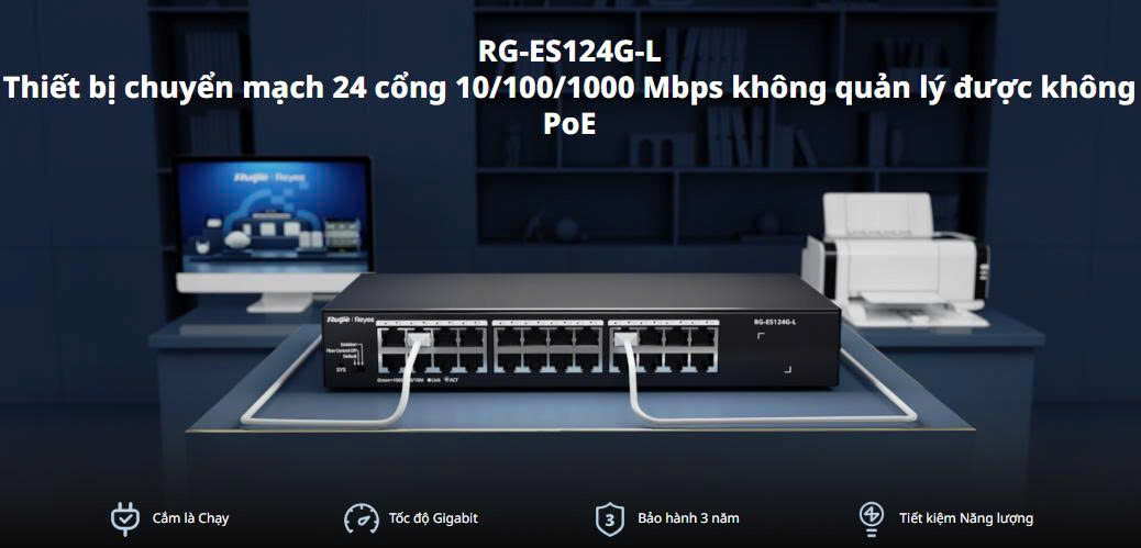 Thiết bị chia mạng Reyee RG-ES124G-L 24 cổng 10/100/1000 BASE-T, tốc độ 48Gbps, 100-240V AC, hỗ trợ gắn tủ Rack