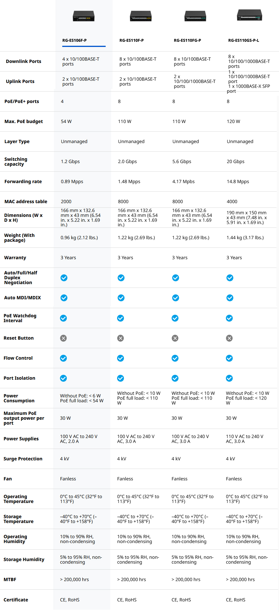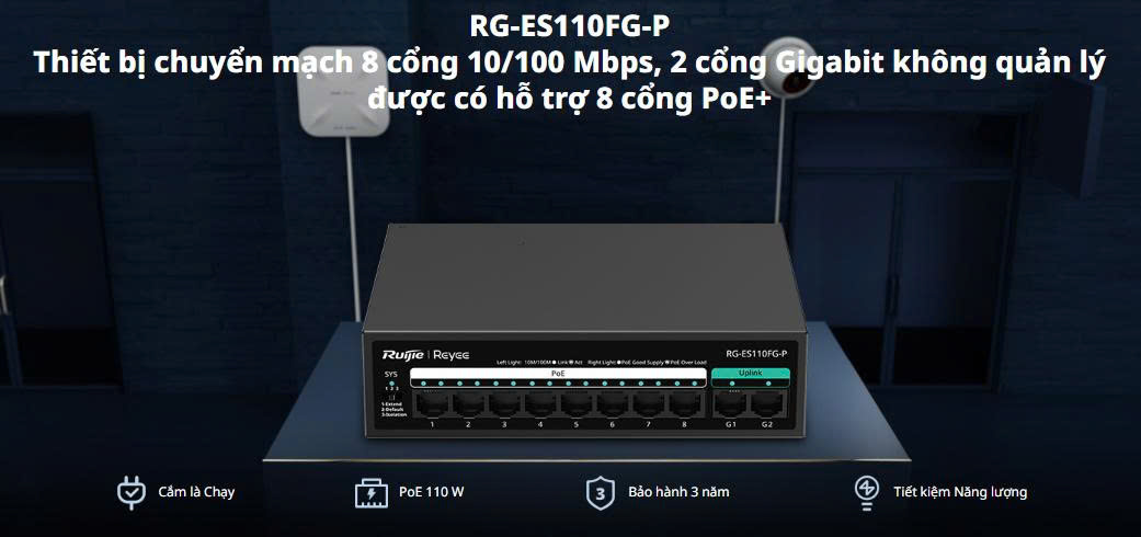 Switch chia mạng 8 cổng Reyee RG-ES110FG-P 8 10/100 BASE-T PoE/PoE+, 2 cổng uplink 100Mps, 5.6Gbps, PoE 110W