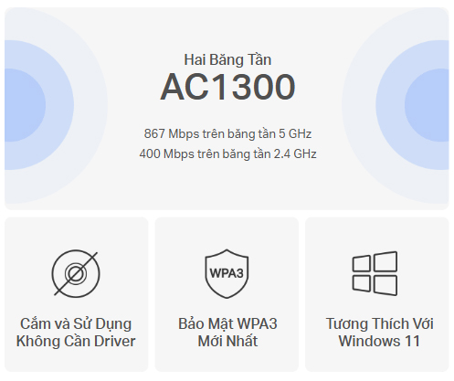 - Tốc Độ Wi-Fi Hai Băng Tần Mạnh Mẽ — Tốc độ lên đến 867 Mbps (5 GHz) và 400 Mbps (2.4 GHz)