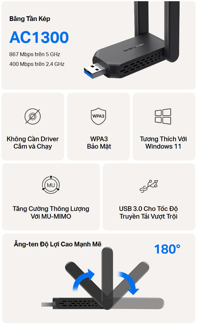 USB Wi-Fi Băng Tần Kép AC1300 Hiệu Suất Cao MA32H