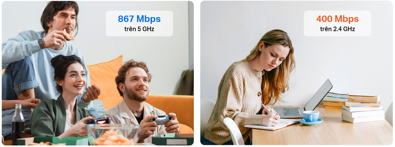 - Wi-Fi Băng Tần Kép Mạnh Mẽ — Tốc độ lên đến 867 Mbps (5 GHz) + 400 Mbps (2.4 GHz)¹