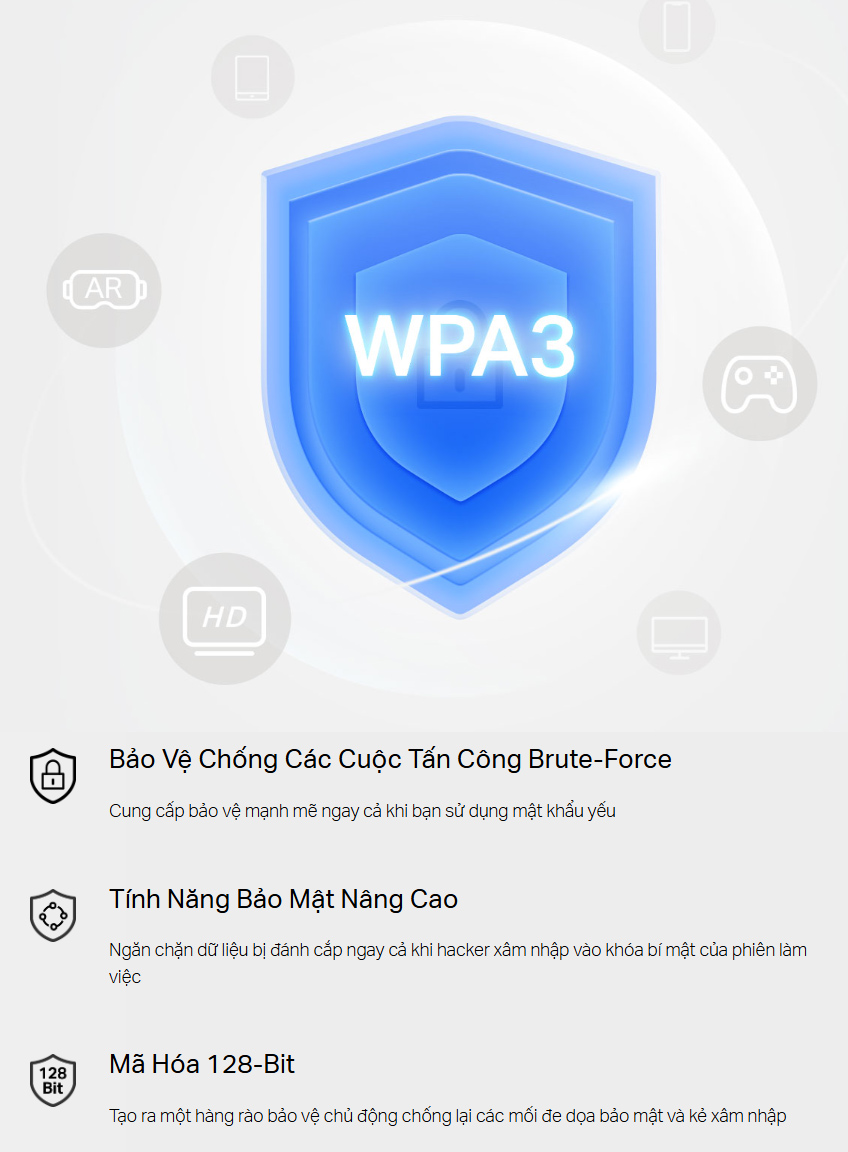 - Bảo Mật Cải Tiến — WPA3, tiêu chuẩn bảo mật mới nhất, giúp bảo vệ thiết bị và thông tin cá nhân khỏi các cuộc tấn công brute-force³