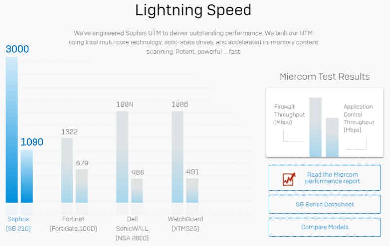 Bảo mật nhanh chóng: Sophos thiết kế dòng Firewall UTM để cung cấp hiệu suất vượt trội sử dụng công nghệ Intel multi-core, ổ cứng SSD, và tăng cường quét nội dung bộ nhớ.