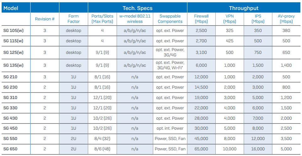 - Sophos UTM Firewall gồm các model trải rộng từ SG105 đến SG650. Đáp ứng cho cả hệ thống nhỏ từ 10 users đến cả doanh nghiệp lớn trên 5000 users. Chi tiết thông tin như bảng sau: