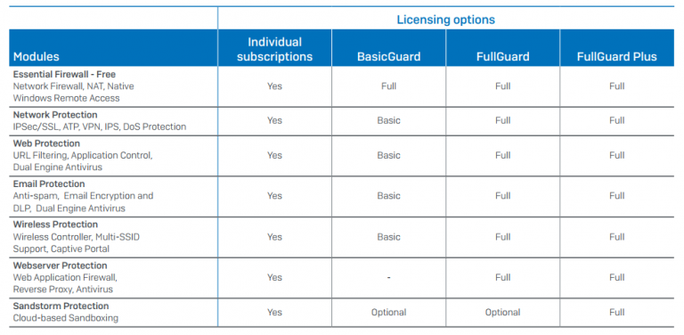 - Về License, Sophos UTM chia thành từng model tùy theo tính năng để dễ dàng cho sự lựa chọn phù hợp để tối thiểu chi phí. Gồm Network protection, Web protection, Email protection, Web Server protection, Wireless protection, Sandstorm protection. Xem chi tiết bảng sau: