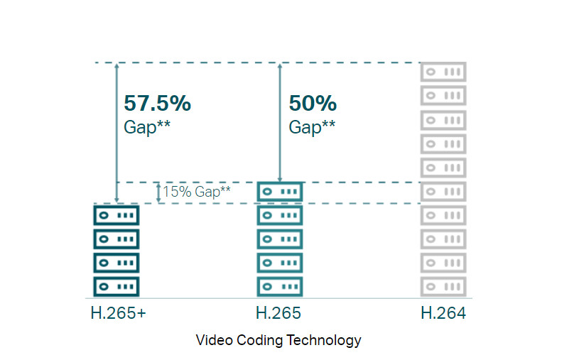 H.265+: Chuẩn nén thế hệ mới, giảm dung lượng ổ đĩa cần sử dụng mà vẫn giữ chi tiết rõ nét của video, giảm tải mạng và giảm chi phí giám sát mà không làm giảm chất lượng hình ảnh.