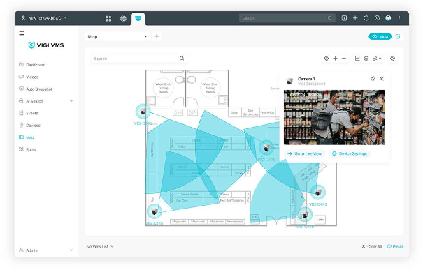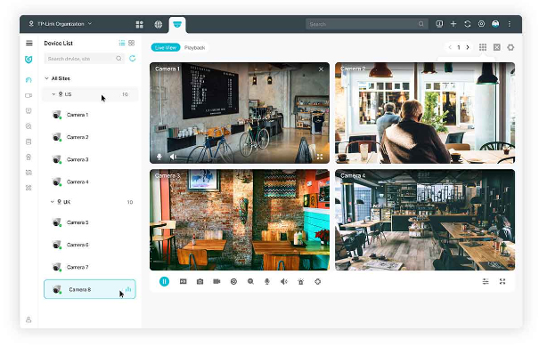 VIGI Cloud VMS cung cấp nhiều tính năng giám sát video thân thiện với người dùng, chẳng hạn như bảng điều khiển trực quan, xem trực tiếp lên đến 64 kênh△, phát lại dựa trên sự kiện và thời gian, giám sát bản đồ theo thời gian thực và quản lý sự kiện hợp nhất. Những khả năng này giúp bạn giám sát hiệu quả an ninh tại mỗi địa điểm.