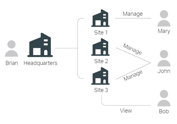 Phân công các quyền hạn khác nhau cho các thành viên tại mỗi địa điểm, chẳng hạn như Quản trị viên, Người xem và Chỉ xem trực tiếp. Điều này đảm bảo các thành viên chỉ truy cập các tài nguyên cần thiết, đơn giản hóa chi phí bảo trì hệ thống cho quản trị viên.