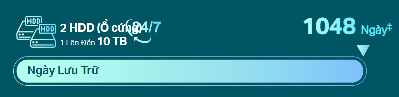 ‡Tính toán dựa trên thử nghiệm trong phòng thí nghiệm sử dụng camera 1* VIGI 3MP với với các cài đặt sau: tốc độ khung hình 25fps, chế độ mã hóa H265+, tốc độ bit 2048Kbps và lưu trữ liên tục 24 giờ. Và kết quả chỉ mang tính tham khảo.