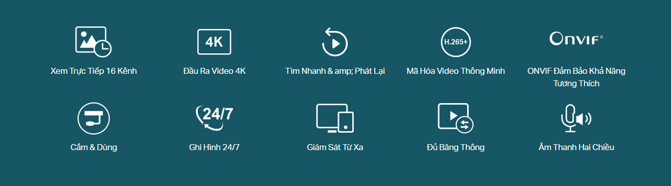 - Đầu Ra Video HDMI 4K & Dung Lượng Giải Mã 16MP: Độ phân giải hình ảnh sắc nét lên tới 8MP và 8-ch@2MP† dung lượng giải mã cho phép bạn thưởng thức nhiều kênh xem trực tiếp và phát lại cùng một lúc.