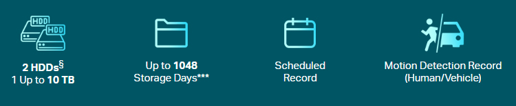 Ghi liên tục 24/7: Lưu trữ lên tới 20 TB cảnh quay (1048 ngày lưu trữ***) từ các camera được kết nối để bảo mật dữ liệu của bạn để truy cập nhanh chóng, thuận tiện.