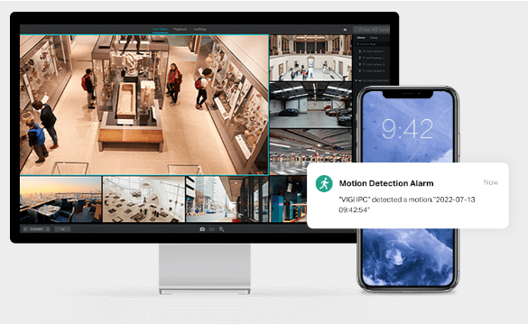 Dễ dàng kiểm tra bảo mật doanh nghiệp của bạn thông qua chế độ xem trực tiếp 24/7. Nhận thông báo ngay khi camera phát hiện điều gì đó bất thường.