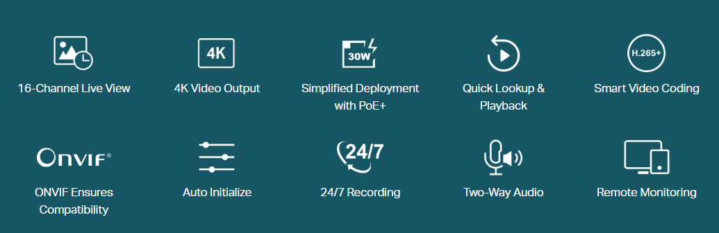 Đầu ra video 4K HDMI & Khả năng giải mã 16MP: Độ phân giải hình ảnh sắc nét lên đến 8MP và khả năng giải mã 8-ch@2MP† cho phép bạn thưởng thức nhiều kênh xem trực tiếp và phát lại cùng một lúc.