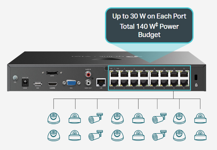 16 cổng PoE+ chuyên dụng để đơn giản hóa việc triển khai camera IP.