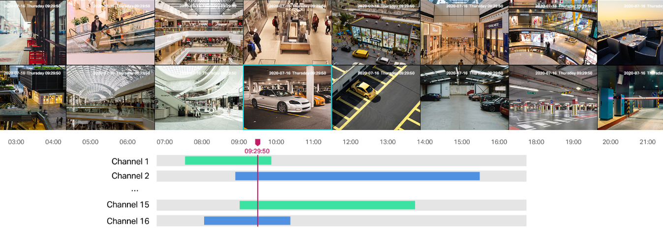 Phát lại đồng thời 16 kênh*: Phát lại nguồn cấp dữ liệu từ tối đa 16 camera cùng lúc, tăng tốc độ phát lại và tìm các sự kiện trong lịch trình video để dễ dàng xem lại cảnh quay.