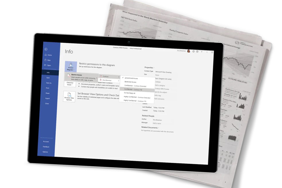 - Khả năng bảo mật tuyệt vời cho doanh nghiệp: Microsoft cung cấp cho Visio nhiều công nghệ bảo mật tương tự như trên bộ công cụ Microsoft 365. Trong đó nổi bật là IRM (trình Quản lý Quyền Thông tin) cho phép người tạo lập bản vẽ, sơ đồ có thể tạo các hồ sơ riêng tư khi sử dụng thiết bị cộng tác.