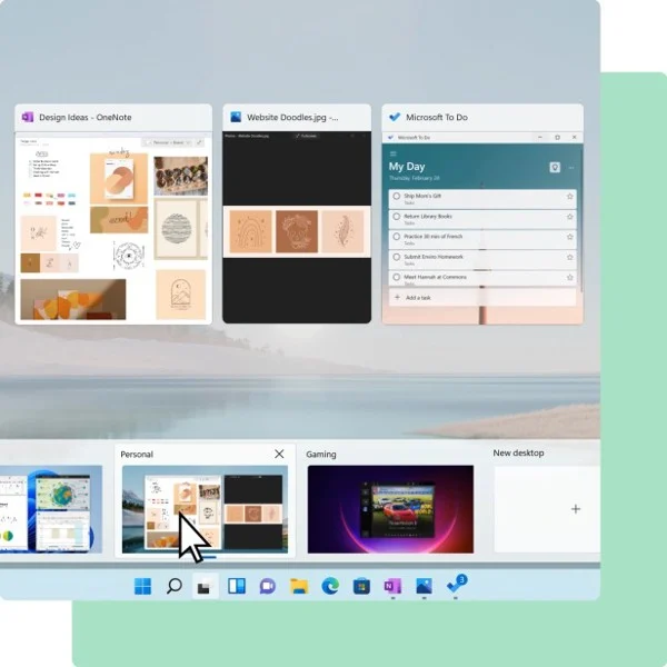 - Tối ưu hóa không gian màn hình bằng các chức năng Snap Layouts, Snap Groups, và Desktops, hỗ trợ thực hiện nhiều công việc cùng lúc.