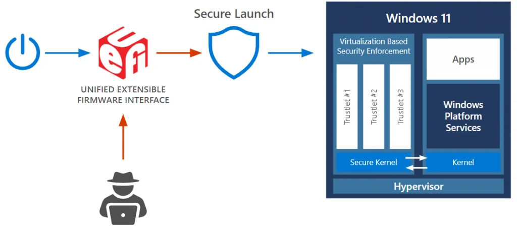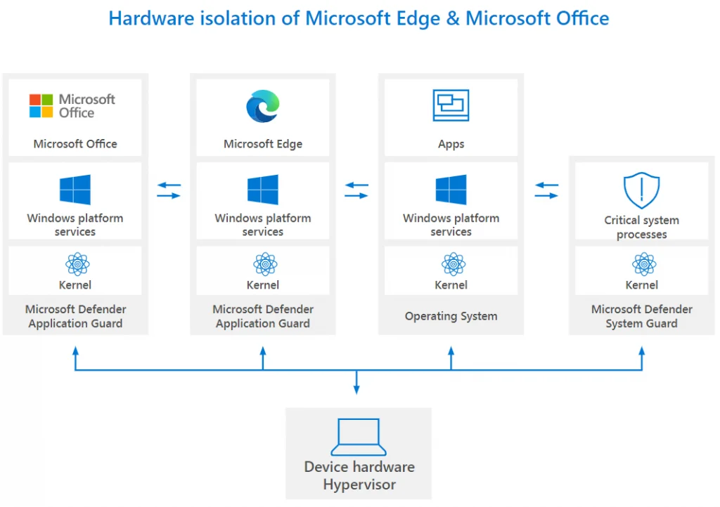 Trên Win Pro 11 phần cứng và phần mềm kết hợp bảo vệ hệ điều hành với virtualization-based-security và Secure-Boot. VBS sử dụng tính năng ảo hóa phần cứng cách ly vùng bộ nhớ an toàn khỏi hệ điều hành. Được kích hoạt sẵn trên CPUs và kết hợp Healtch check sẵn sàng cho bảo mật Zero Trust.