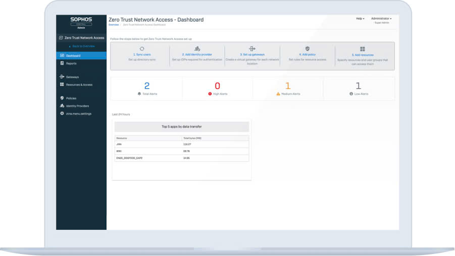 Sophos Central đang trở thành một thành phần không thể thiếu của bất kỳ sản phẩm Sophos nào. Central có mục đích dùng để cấu hình ZTNA gateway, áp dụng chính sách, một giao diện để quản trị viên có thể theo dõi hoạt động của các user/thiết bị đang truy cập vào tài nguyên dữ liệu của doanh nghiệp, đồng thời là nơi chứa báo cáo, nhật ký về các sự kiện trong hệ thống ZTNA của doanh nghiệp. ZTNA client được tích hợp với cách tính năng Synchronized Security và Security Heartbeat cung cấp cho người quản trị cái nhìn toàn cảnh nhất về trình trạng an toàn thông tin của doanh nghiệp trên một giao diện duy nhất.